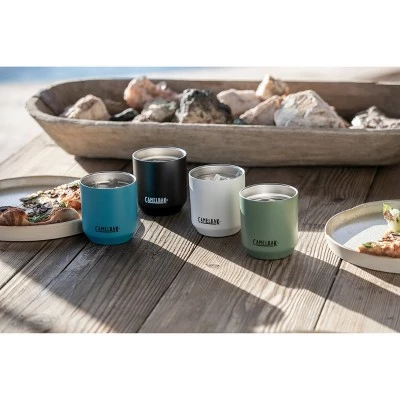 Make it a double with the CamelBak Horizon double-walled 10 oz Rocks Tumbler. Don’t worry about your cocktail losing its cool for a whole 5 hours, thanks to the vacuum-insulated stainless steel that keeps everything at the ideal temperature. You gotta feel it to believe it with our full powder coat finish, durable enough to go from backyard deck to dishwasher. The tri-mode lid slides open to suit your sip and is spill-resistant when closed. A non-slip silicone base seals the deal and grips surfaces to avoid scratches and accidents. Free of BPA, BPS, and BPF.