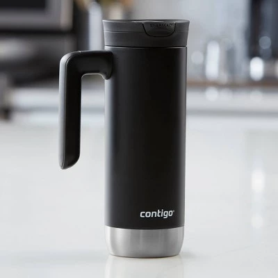 The SnapSeal Insulated Stainless Steel Travel Mug with Handle, 20 oz., keeps drinks hot up to 7 hours or cold up to 18 thanks to THERMALOCK double-wall vacuum insulation. The one-piece SNAPSEAL lid allows for one-handed drinking with no lids or caps to remove or misplace and is leak-proof when closed. Plus, a carrying handle offers more comfort on the go.