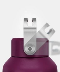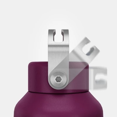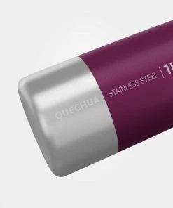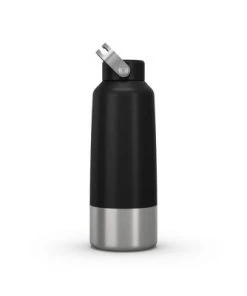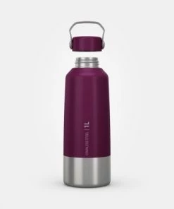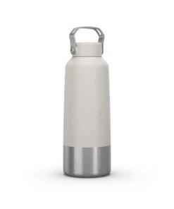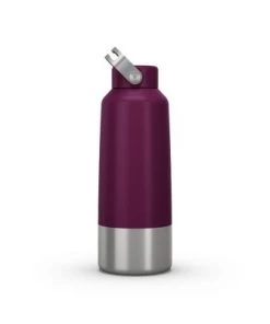 The Quechua MH100 stainless steel screw top hiking water bottle holds 34 ounces total and comes in three color choices: plum, carbon gray, and putty. The stainless steel design makes this water bottle extremely durable and strong enough to withstand bumps and drops that come with hiking outdoors. The screw cap is easily removable and just as easily screws back on with one quick turn.The bottle also features a large carry handle and a wide spout to make refilling the bottle much easier. The stainless steel is food-grade but not isothermal and it doesn’t leave a metal aftertaste. To keep your drink cool, it’s recommended to purchase the 1 L isothermal cover, sold separately.