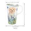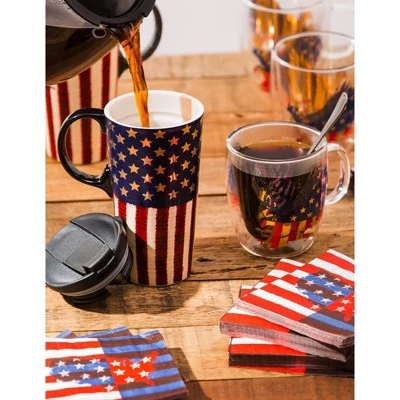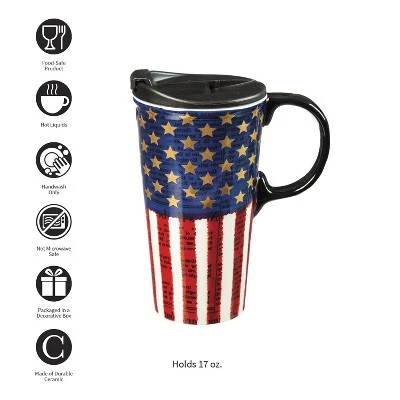 This 17 oz. ceramic travel cup shows a patriotic American flag with gold stars against news type. Top rack dishwasher safe and fits in most cup holders. Gift box included. It has a handle and a leak-free lid. Not microwave safe due to metallic accents.