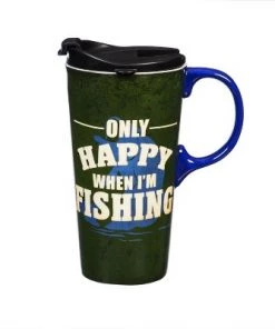 This 17 oz. ceramic travel cup comes with a flip top black lid and a matching gift box. It has a blue handle. The dark green mug reads: Only Happy When I’m Fishing. Great for Father’s Day and beyond. Microwave & dishwasher safe. At Evergreen, we are committed to producing premium, quality products to bring a touch of color and personality to your home. We respect and celebrate the uniqueness in everyone by offering one of the world’s largest selections of home and garden decor.