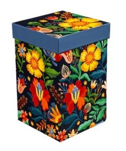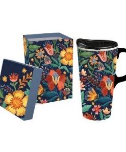 This Folky Fun ceramic travel cup comes with a matching gift box and flip top black lid. Featuring a folk-inspired floral design with pops of golden yellow, the mug holds up to 17 ounces. Dishwasher & microwave safe.
