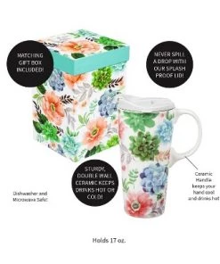 This 17 oz. ceramic travel cup comes with a flip top white lid and a matching gift box. It has a white handle. The white mug features colorful succulents in pink, blue, and green pastels with gold accent. Microwave & dishwasher safe. At Evergreen, we are committed to producing premium, quality products to bring a touch of color and personality to your home. We respect and celebrate the uniqueness in everyone by offering one of the world’s largest selections of home and garden decor.