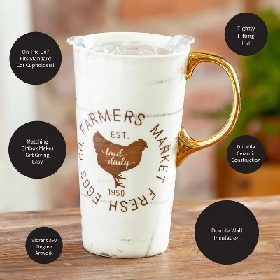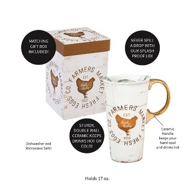 This 17 oz. ceramic travel cup comes with a slide closure Tritan lid and a matching gift box. It has a gold handle. The mug features a farmhouse style wood with a stamp that reads: Farmers Market Fresh Eggs Co. Est. 1950. Chicken icon: laid daily. At Evergreen, we are committed to producing premium, quality products to bring a touch of color and personality to your home. We respect and celebrate the uniqueness in everyone by offering one of the world’s largest selections of home and garden decor.