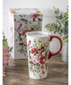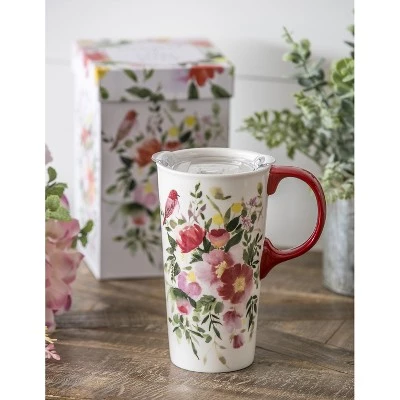 This 17 oz. white ceramic travel cup comes with a slide closure Tritan lid and a matching gift box. It has a red handle. It features red, pink, yellow florals and a cardinal bird. Microwave & dishwasher safe, remove top. At Evergreen, we are committed to producing premium, quality products to bring a touch of color and personality to your home. We respect and celebrate the uniqueness in everyone by offering one of the world’s largest selections of home and garden decor.