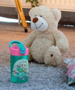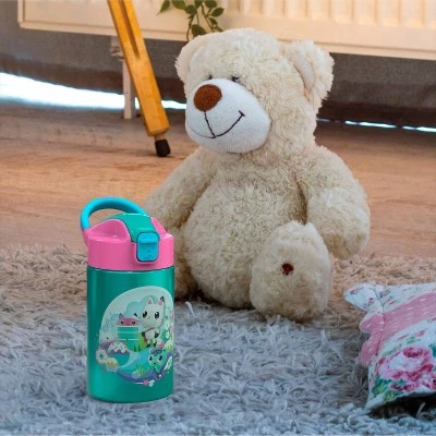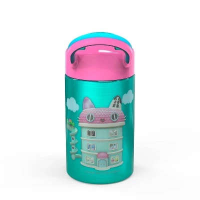 Help kids stay hydrated at the touch of a button with this Gabby’s Dollhouse stainless steel water bottle! The comfortable silicone spout has a cover to keep it clean and is made with antimicrobial materials, to help prevent the spread of germs. It opens at the push of a button, but includes a built-in locking mechanism to help stop accidental spills: simply slide the locking mechanism down to block the action lid, or up to unlock before pressing the button. The 14-ounce bottle is vacuum insulated, which keeps drinks cold for up to 10 hours and prevents condensation. All the materials are durable and BPA free, and a built-in carrying handle makes travel easy, letting kids hydrate on the go.