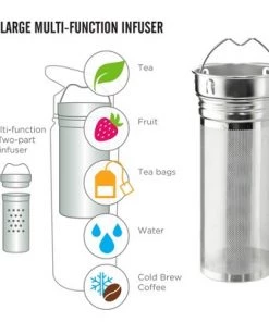 - The stainless steel, multi-function two part infuser allows you to steep your loose leaf tea, blooming tea, tea bags or fruit and herbs right in the flask. The extra long infuser has fine mesh holes that ensure majority of small particles won’t filter through, and comes with removable top piece for fruit infusions. Simply place your fruit, herbs or ice in the bottle, fill it with water and place the top strainer piece of the infuser in the bottle until it clicks. Then sip your fruit infused water and enjoy!
