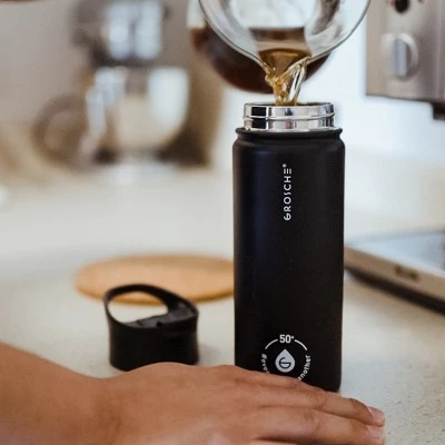 The CHICAGO Steel 16 fl. oz Stainless Steel Tea infuser flask is a perfect companion for anyone who drinks coffee, loose leaf tea, or infused water. Whether youre working from home, back in the office, at school, outdoors or travelling, this insulated flask can act as a coffee tumbler, portable tea infusion flask, a cold brew coffee maker, or a fruit infuser bottle. The CHICAGO Steel water and tea infusion bottle has been designed for both form and function.Made of durable double walled vacuum insulated stainless steel, the CHICAGO Steel tea infuser bottle will keep your coffee or tea hot for up to 12 hours, and water or other drinks cold for up to 24 hours with its double walled vacuum insulated body. What makes it unique is that it comes with an extra long infuser that allows you to brew and steep your loose leaf tea or your fruit infused water right in the flask! With a 16 fl. oz capacity and extra large tea infuser basket, you will want to bring this perfect on-the-go bottle with you everywhere! Its not only ideal for infused water or tea, but also for every day coffee. The 16 oz size is equal to a ”Grande size” from coffee chains, and the insulation will keep your coffee hot for you to enjoy.This leak-proof multi function water, coffee, or tea infusion flask is great for enjoying tea at your desk at home, or on the go. The leak proof easy flip lid snaps in place and will keep your beverage secure. The large multi-function infuser can be used for tea, fruit, tea bags, water or cold brew coffee. The multi-function two-part infuser is also completely removable. Hand washing is recommended, not for dishwasher use. Its BPA & lead free.Every time you buy a GROSCHE product you’re providing 50+ days of safe water to people in need via the GROSCHE Safe Water Project. Every Chicago Steel Infusion bottle is marked with the GROSCHE Safe Water Project 50+ logo to affirm the change you’ve made in someone’s life by giving 50+ days of safe water to someone in need with purchase. GROSCHE is a social enterprise and a certified Benefit corporation on a mission to help those without safe water, and funds its efforts with the sale of its coffee, tea, and hydration products. It makes a great gift idea as well – Its the gift that gives back.
