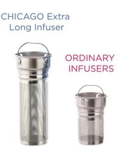 - Includes 2-in-1 multifunction infuser that can be used to hold your loose leaf tea or used as a strainer to hold your fruit and herb infusions back as you enjoy fruit infused water. The infuser is removable and detachable. You can use 18/8 stainless steel strainer by itself to hold back fruit, tea bags or ice cubes, or use it with the 18/8 stainless steel infuser to hold loose leaf tea or coffee grinds. The CHICAGO extra long infuser steeps and infuses better than ordinary infusers since it goes deeper into the bottle