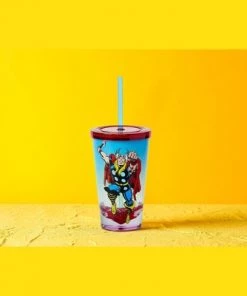 Show off your love of Marvel with this officially licensed carnival cup by Just Funky! Clear plastic cup with red straw and screw down lid holds approximately 19 ounces and features a fun retro image of Thor. Sure to make a great gift for your favorite Marvel fan! Not dishwasher or microwave safe. Hand wash only.