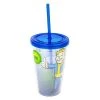 - Includes a hard plastic lid and drinking straw.