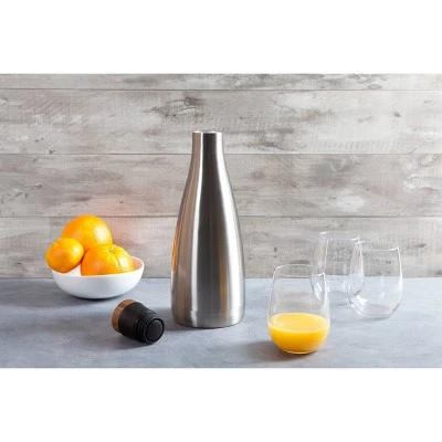 Serve up some elegance with this entertaining essential. Perfect for keeping chilled wine cool, this polished Carafe features a luxe acacia wood cork that preserves beverage temperature and prevents spillage. Keeps liquid cold for 24 hours and hot for 12, the Carafe is great for dinner parties, tailgates, and picnics! Stainless steel vessel is hand wash only, no abrasives. Not for use in microwave or freezer and not intended for carbonated or fermented beverages.