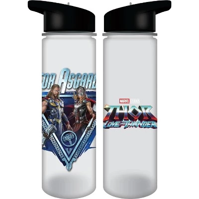 - CUSTOM DESIGN: Thor and Jane Foster pose in a blue triangle above a Mjolnir logo. The movie’s title appears above the characters and on the other side of the water bottle in this fun custom design.