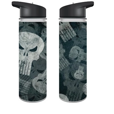 Channel your inner Marvel gunfighter with this 24-ounce water bottle! The recognizable skull logo water bottle features a big, bold graphic that has been professionally UV printed to ensure long-lasting print quality. The Punisher merchandise includes a twist-on lid with straw, and is made of durable BPA-free plastic that is top-rack dishwasher safe. The Punisher skull logo water bottle is an officially licensed product, and makes a great gift for any Marvel fan.