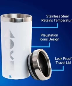 Enjoy your favorite beverage in style! This officially licensed mug is made of rugged Stainless Steel that holds heat well. A spill proof lid makes your drinking experience enjoyable. Stainless steel retains temperature. PlayStation Icons design. Leak proof travel lid. Hold 450ml (15fl oz), hand wash only, not microwave safe. Produced by Paladone.