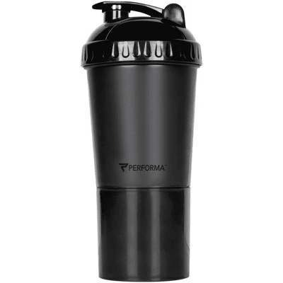 The Performa Activ 24 oz. Shaker Cup Plus features a self-contained removable storage container that is attached to the bottom. Now you can easily hold multiple servings of powder and pills along with your drink! This shaker cup is 100% leak-free when closed and offers ActionRod Technology that ensures a solid mix every time. When you are finished, easily disassemble and clean in your dishwasher. Features: Stay-open flip cap. Extra-wide mouth. Patented stainless steel mixing ball. Screw-on leak-free lid without rubber seal. Easy to use, easy to clean, and dishwasher safe. Mix, pour and store in the same container.