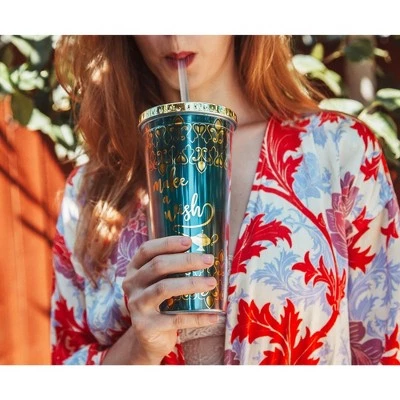 - FUN DESIGN: Brilliant blue tumbler with gold accents and lid features the Genie’s magic lamp with the text “Make A Wish”.