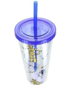 Show off your love of a galaxy far, far away with this fun tumbler! Tumbler features Japanese writing with the droids R2-D2 and C-3PO drawn in a fun, child-like manner. Durable plastic construction with lid. Hand wash only. Not dishwasher safe. Do not microwave.