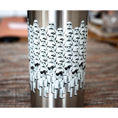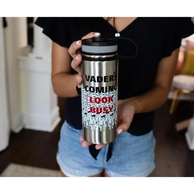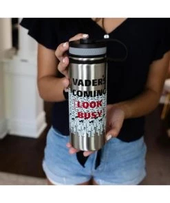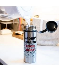 - FUN DESIGN: Silver canteen features a group of Imperial Stormtroopers at attention with the text “Vader Is Coming, Look Busy”.