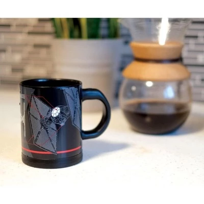 - FUN DESIGN: 12 ounce black mug features the schematic for a TIE Fighter SF.
