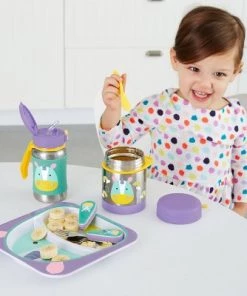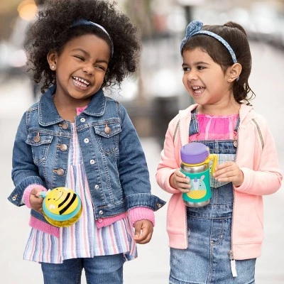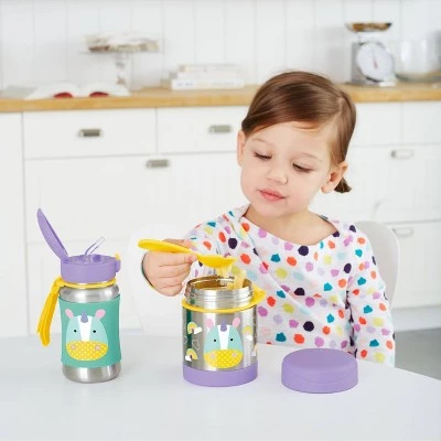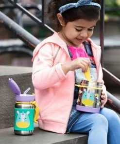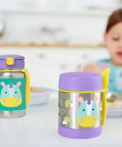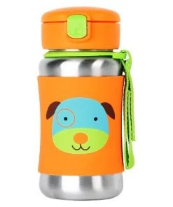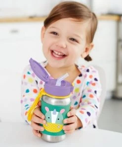 Our kids stainless steel water bottle has a no-slip silicone sleeve to protect little hands from cold surfaces. Featuring our signature Skip Hop Zoo characters, it has a handy grab-me strap that attaches to anything, along with a pop-up lid so the flexible straw stays clean.