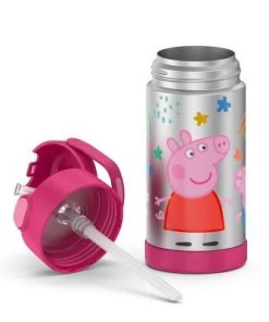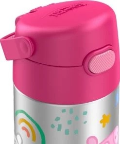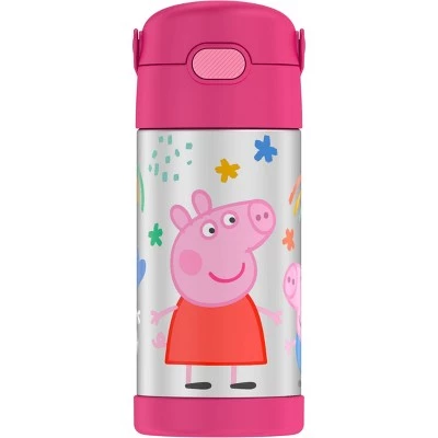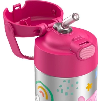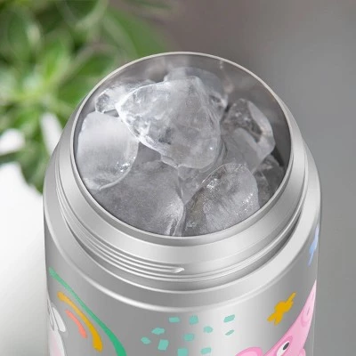 The FUNtainer® 12oz Vacuum Insulated Stainless Steel Water Bottle with Straw keeps drinks cold for up to 12 hours. The double wall stainless steel construction is built to handle drops, dings and assorted roughhousing. Includes an integrated carry handle with soft-touch grip, making it easy for kids to carry with them throughout the day. Help keep germs away with the hygienically covered silicone straw which is removable for easy cleaning. To clean, you can pop your FUNtainer water bottle in the dishwasher; however hand washing is recommended. Not for use with hot liquids.
