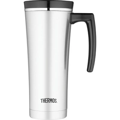 The Sipp by Thermos line of products embodies sleek, stylish and functional design. The Thermos 16 oz Sipp Insulated Stainless Steel Travel Mug is constructed with durable double wall stainless steel and Thermos vacuum insulation technology to keep beverages hot for up to 9 hours or cold for up to 20 hours. Features include a sturdy integrated handle and a push button lid that operates easily with one hand. Additionally, the lid comes equipped with a built-in tea hook that will hold tea bags or most loose leaf tea infusers for easy brewing on the go. Thermos vacuum insulation technology for maximum temperature retention. Keeps contents hot for up to 9 hours or cold for up to 20 hours. Durable stainless steel interior and exterior. Sturdy integrated handle. Exterior stays cool to the touch with hot beverages and sweat-proof with cold. One-handed push button lid. Built-in tea hook holds tea bags or most loose leaf infusers. Fits most automobile cup holders. Compatible with most single cup brewing systems. Dishwasher safe. 16-ounce capacity.
