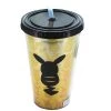 - Red travel cup with lid features silhouettes of Harley and Joker with the text “Mad Love”.