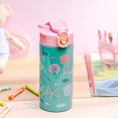 The water bottle holds 14 ounces and is made of food-grade stainless steel, durable enough for kids to take anywhere they want. It’s vacuum insulated, so cold drinks stay cold for longer and condensation won’t form on the outside of the bottle. The screw-on lid has a built-in carrying loop for easy transportation, and doesnt leak when its closed, so the bottle can be tossed into a bag for worry-free travel. When its not being used, the comfortable silicone spout can be covered to keep it clean, with a button that easily opens it and a lock to keep it shut. The bottle should be washed by hand to preserve the vacuum seal and keep the artwork bold and bright, though the lid can be washed in the top rack of the dishwasher. Do not microwave.