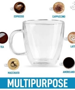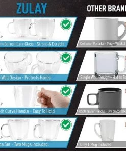 These double-wall thermo mugs are durable and stylish. Made from borosilicate glass, they are less likely to crack and are more resistant to temperature changes than regular types of glass. Specifically designed to suspend drinks in its inner wall for a magnificent look. Have a coaster-free drink with this mug that offers good insulation for any beverage. This 2 mug set can hold a double shot espresso drink. Its capacity is 5.4oz so you can add other ingredients. Glass remains cool-to-the-touch and helps keep hot drinks stay warm longer. It also prevents condensation on the outer surface when drinking a cold beverage. Now you can drink your hot liquid with ease. Can also be used as cappuccino cups, lungo cups, macchiato, latte, demitasse cups, and more. This material is resilient to scratches and doesn’t absorb other tastes or scents of other liquids. These are anti-acid corrosion so you can safely use them with different drinks like tea, smoothie, carbonic acid, fruit acid like juices. Dishwasher friendly. Not only are they functional but these mugs are perfect additions to your kitchen, café, or restaurant. The perfect cup for cold or sunny weather! Enjoy it however you like. These ultra-light mugs are the perfect gift for all coffee lovers in your life. Double Wall Design – Smooth Curved Rim Comfortable on Lips, Double Wall Insulated Design – Keeps Hands Protected From Heat, Thick Borosilicate Glass – Shock & Scratch Proof, Suspended Bottom – Prevents Condensation, Smooth Curved Handle – Comfortable To Hold. 5 oz Capacity (3″x3.25″) – Double-Wall Insulated, Heat Resistant Surface, Scratch Proof, Suspended Bottom. Durable Borosilicate Glass – Shock proof & Scratch Proof, Suspended Base – Prevents Steam & Condensation, Thick Double-Wall Design – Keeps Hands Protected. Smooth Curved handle – Comfortable To Grip. Multipurpose – Espresso, Cappuccino, Latte, Tea, Macchiato, Americano. Insulates Hot & Cold Drinks. Hot – Prevent Condensation, Protects Countertops, Keeps Hands Protected. Cold – Prevent Condensation, Protects Countertops, Keeps Hands Protected. Zulay – Premium Borosilicate Glass – Strong & Durable, Double Wall Design – Protects Hands, Smooth Curve Handle – Easy To Hold. 2 Piece Set – Two Mugs Included. Other Brands – Common Porcelain Mug – Weak & Cheap. Single Wall Design – Hot To Touch. Rectangular Handle – Uncomfortable To Hold, Only 1 Mug Included.
