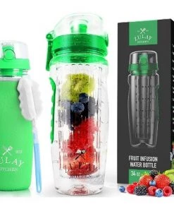 Premium leak-proof & shatter-proof design. Hydrate yourself every day with a delicious twist using our leak-proof and shatter-resistant water bottle. Built with infuser and flip-top lid that secures itself around an airtight seal, preventing any leaks. Experience the flavor of infused water with this BPA-free bottle made from top-quality Tritan that is both incredibly durable and long-lasting. Taste only the pure essences of fruity infusions with zero odors or plastic aftertaste.Shatterproof Material, Anti-Slip Grip, Leak-Proof Locking Lid, Fliptop Lid, Watter Intake Time Markers, Full Length Infusion Rod. Bonus: Insulation Sleeve, Cleaning Brush, Infuser Rod, Recipe Book. Leakproof – Silicone Seal, Fliptop Lid, Anti Slip Grip. Large 34oz Capacity – Holds More Than Most Water Bottles Available, 3.5inx9.85ozx3in.
